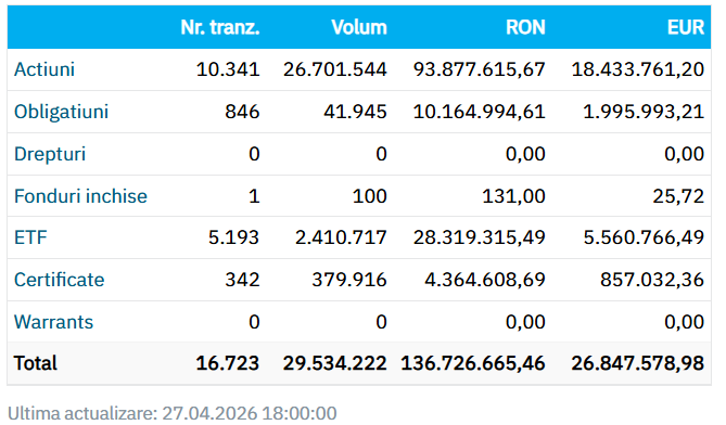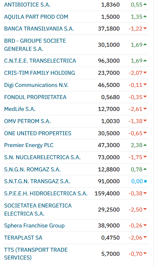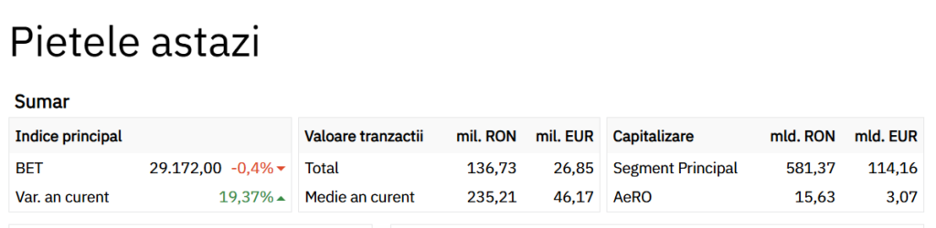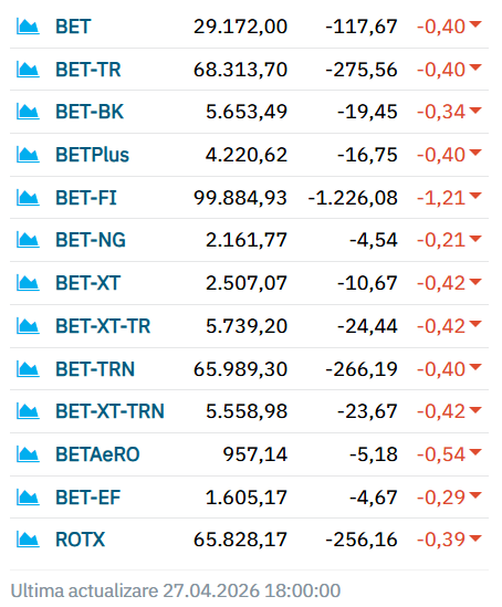 Bursa de Valori București (BVB) este în scădere luni, 27 aprilie, după un început de zi bun, cu creșteri. Însă anunțul că AUR se aliază cu PSD pentru a da jos Guvernul Bolojan prin moțiune de cenzură a schimbat direcția inițială a bursei. Toți indicii sunt pe pierdere, iar acțiunile unor companii importante listate la BVB (Banca Transilvania, MedLife, Nuclearelectrica, Teraplast, Electrica) au scăzut puternic.