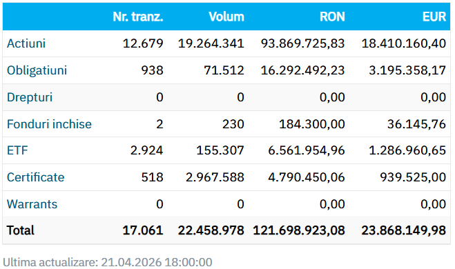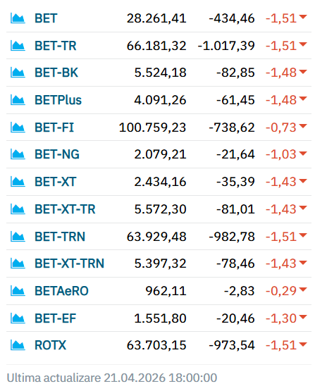 Bursa de Valori București (BVB) scade și azi, 21 aprilie, destul de puternic. Investitorii par să-și fi pierdut apetitul în perspectiva unei crize politice care poate trage toată economia României în jos. În acest context pierderile de pe bursă sunt regula, nu excepția. Azi bursa de la București este conectată la trendul pe care pare că s-au instalat marile burse europene, care experimentează scăderi ușoare, însă importante în contextul geopolitic actual.