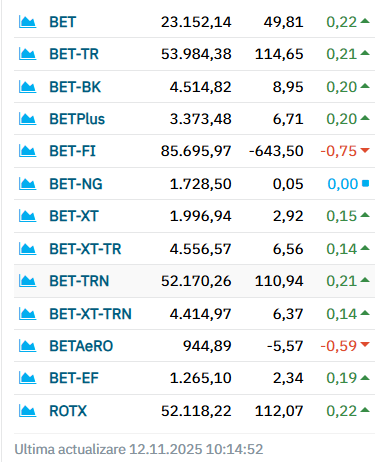 Bursa de Valori București (BVB) a început ședința de miercuri pe verde, cu majoritatea indicilor principali în creștere. Optimismul investitorilor a fost resimțit încă din primele minute ale tranzacțiilor, pe fondul apetitului pentru acțiuni din sectoarele cheie ale pieței. Titlurile companiilor cu lichiditate ridicată au înregistrat creșteri ușoare, conturând o deschidere pozitivă, iar investitorii au dat semnale de încredere pentru continuarea zilei.