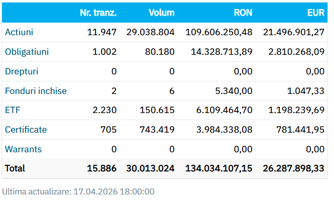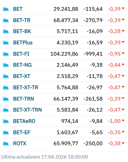 Bursa de Valori București (BVB) încheie o săptămână scurtă, dar în general bună, cu mici corecții vineri, 17 aprilie. Este în continuare multă prudență în rândul investitorilor, care reacționează la orice mișcare economică globală. Pe fondul unor ușoare scăderi ale preţurilor petrolului vineri dimineaţă în Asia, după intrarea în vigoare a armistiţiului dintre Liban şi Israel, marile burse europene dar și asiatice au avut un parcurs pozitiv.