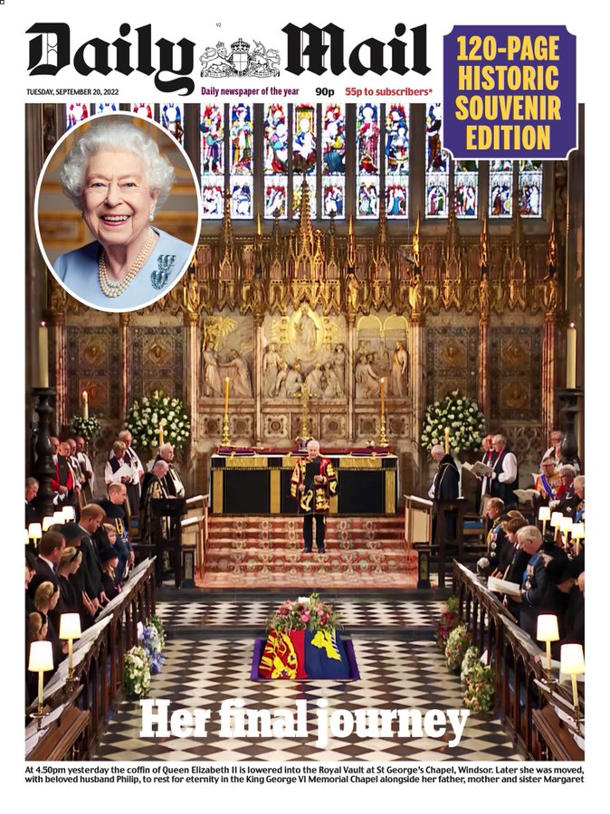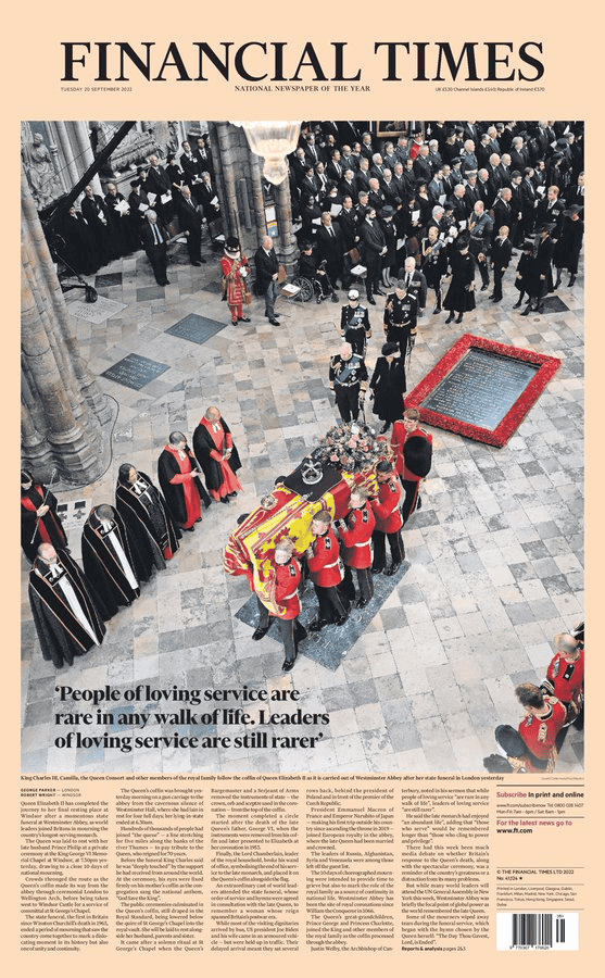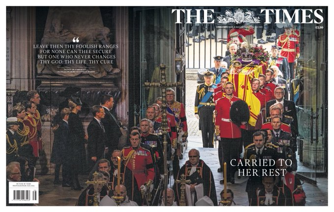 The Times, care de regulă publică o fotografie de ansamblu la mari evenimente, a ales de asemenea un moment cu sicriul Reginei care este adus în Westminster Abbey, unde a avut loc prima slujbă a zilei.