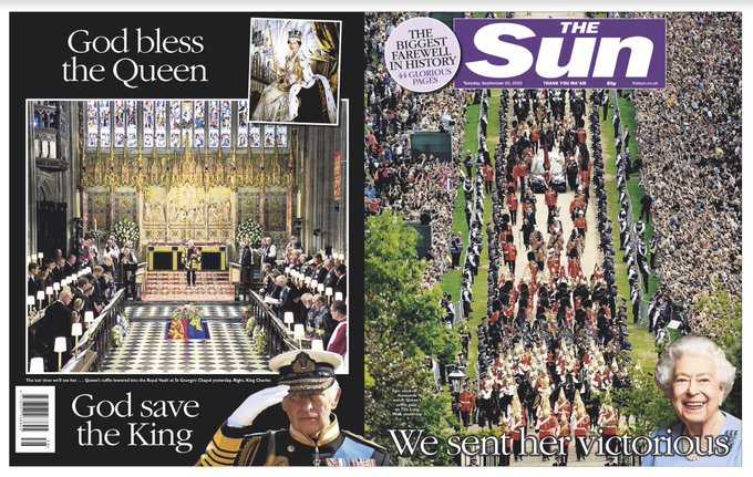Primele pagini de marţi ale ziarelor din Marea Britanie, după înmormântarea Reginei Elisbeta a II-a, au publicat imagini istorice de la slujbele din Westminster Abbey şi din St. George Chapel sau cu sicriul fostei suverane, dar şi cu noul Rege Charles III.