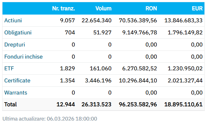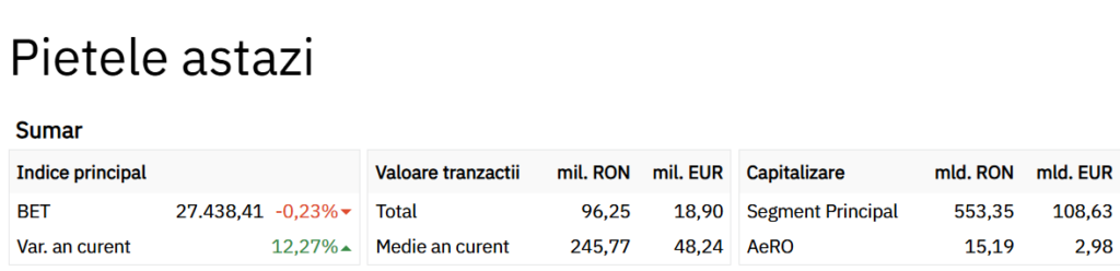 Bursa de Valori București (BVB) închide ziua și săptămâna pe roșu, cu unele creșteri totuși. Indicele principal BET este în ușoară scădere, la fel ca majoritatea indicilor, însă sunt și ușoare creștere: BET-NG și BET-FI se apreciază ușor.