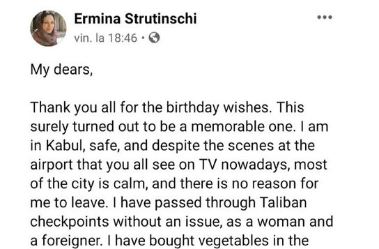 Ermina Strutinschi locuiește în Kabul, capitala Afganistanului,și este directorul filialei locale a International NGO Safety Organisation, potrivit site-ului StiriSuceava.net. Ea spune că orașul este „în mare parte calm”, că a trecut fără probleme prin punctele de control ale luptătorilor talibani, că magazinele sunt deschise și că electricitatea și telecomunicațiile funcționează.